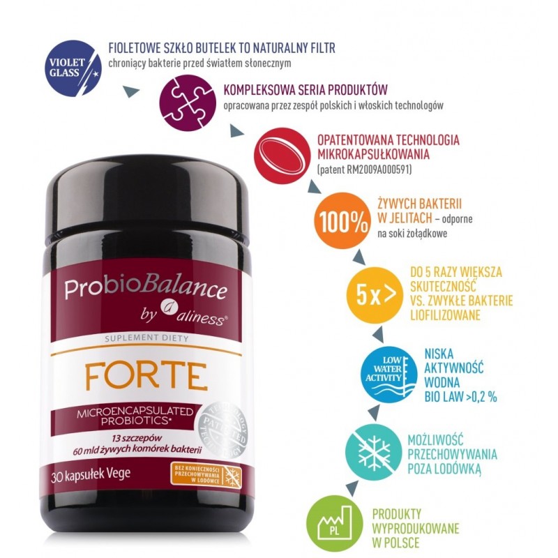 Suplement diety Probiobalance by Aliness Forte to probiotyk o bardzo dużej ilości bakterii w jednej kapsułce. Zawiera prebiotyk - Polisacharyd Fibregum™ Bio LAW, ekstrakt z babki Lancetowatej (Plantago Lanceolata) i bakterie Bifidobacterium breve BR03, Lactobacillus acidophilus LA02, Bifidobacterium animalis lactis BS01, Lactobacillus plantarum LP01, Lactobacillus paracasei LPC00,Lactobacillus rhamnosus GG ATCC 53103, Lactobacillus plantarum LP09, Lactobacillus casei LC03, Streptococcus thermophilus YO8, Bifidobacterium longum BL03, Bifidobacterium bifidum BB01, Lactobacillus crispatus LCR01, Lactobacillus salivarius CRL1328.